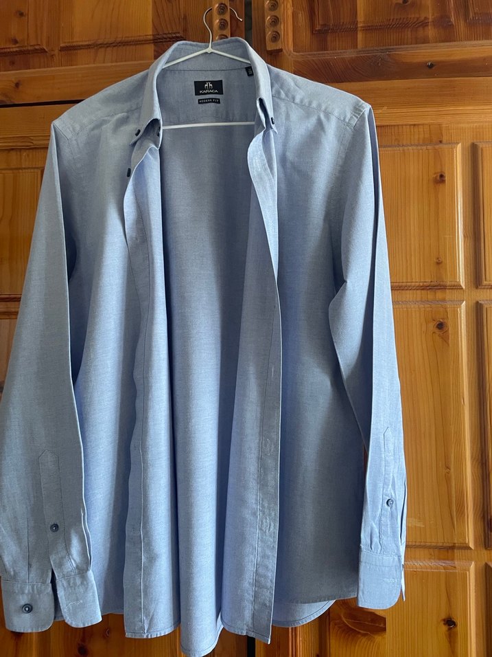 Bu erkek gömlek, kesik yaka ve düğmeli uzun kollara sahiptir. Keten kumaştan, normal boyda ve regular fit kesimdedir. Mavi-gri tonlarında, iş ortamına uygun sade tasarımlıdır.