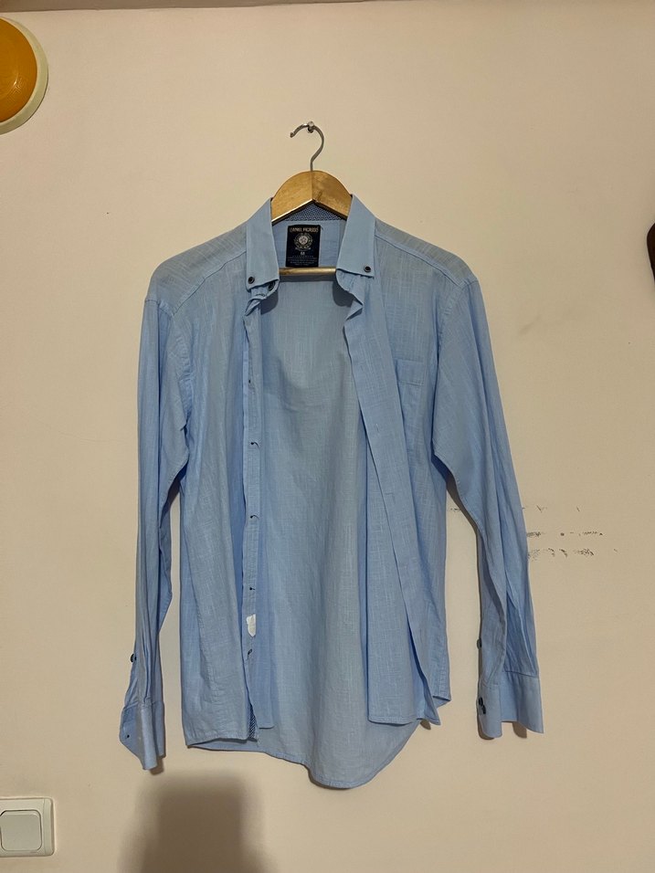 Uzun kollu, yaka düğmeli erkek gömlek. Hafif keten kumaştan, rahat kesim ve pastel mavi renkte, günlük sokak stili için uygundur.