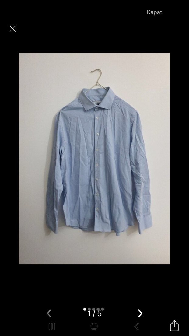 Mavi keten kumaştan, uzun kollu, düğmeli ve klasik kesim erkek gömlek. Ofis kullanımı için uygundur.