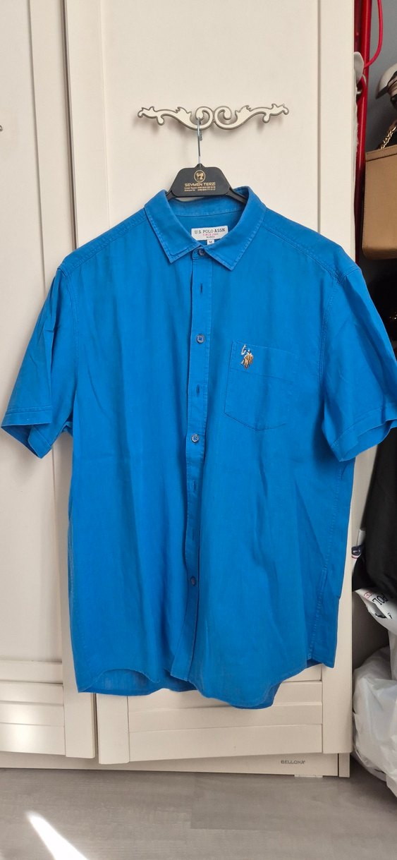 Parlak mavi keten kumaştan, kısa kollu, yakalı, düğmeli, cep detaylı rahat kesim erkek gömleği. Günlük sokak stiline uygun.