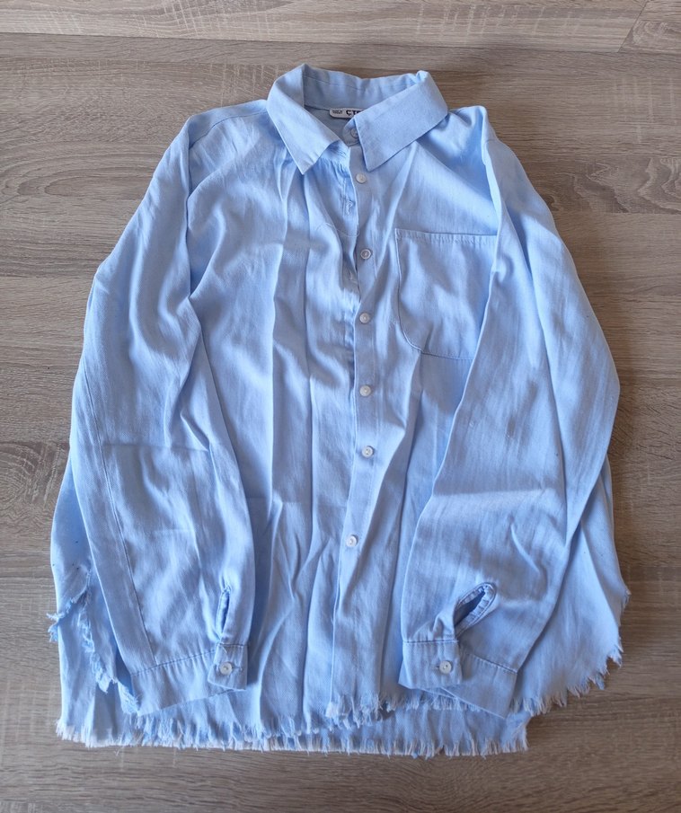 Pastel mavi keten gömlek, düğmeli ön ve uzun kolludur. Salaş kesimi, bohem tarzı ve günlük kullanıma uygun midi boyda, desensizdir. Xl yazıyor ama m/l bedene uygundur.