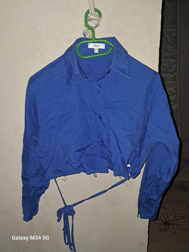 Mavi gömlek, düğmeli, uzun kollu ve bol kesimdir. Normal crop boyda, rahat ve günlük dış mekan kullanımı için uygundur.