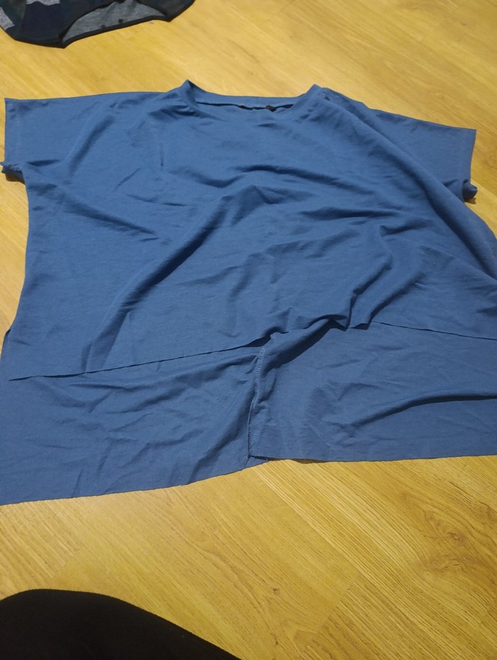 Mavi renkte, yumuşak keten kumaştan yapılmış, kısa kollu ve salaş kesim hamile tişörtü. Rahat günlük kullanım için idealdir.