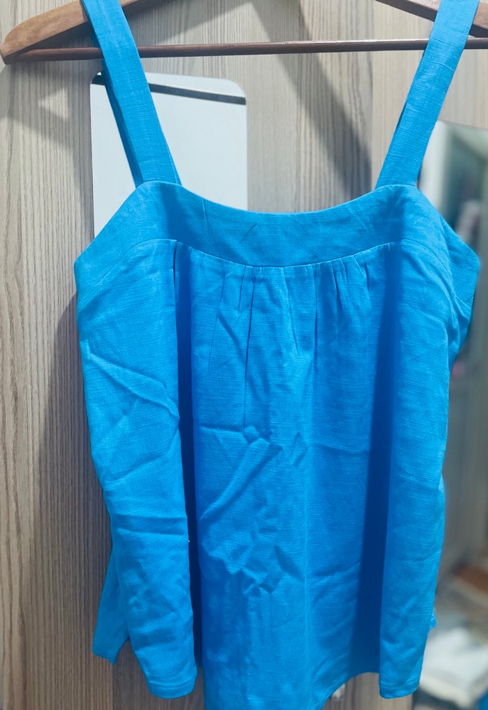 Qu Style Marka, hiç giyilmemiş sıfır ürün . Model olarak dikildiği için etiketi yok sadece. Mavi keten kumaştan, straplez yakalı ve salaş kesim kadın atlet. Midi boy ve minimal tasarımıyla günlük rahatlık ve şıklık sunar.