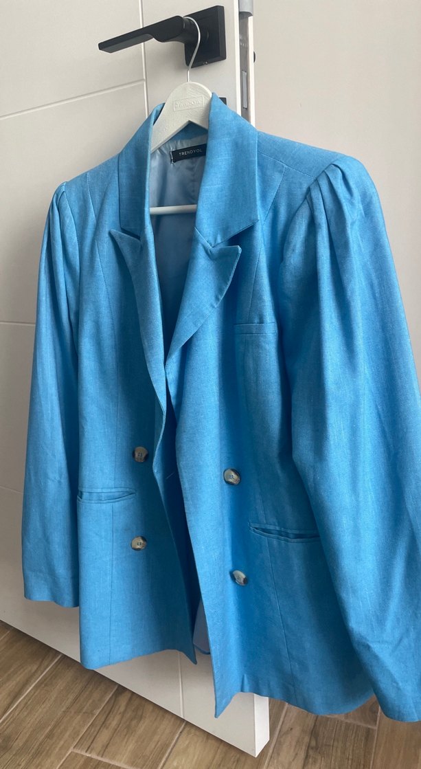 Mavi keten kumaştan, yakalı ve düğmeli kadın blazer ceket. Normal kesim, uzun kollu ve midi boyda, ofis kullanımı için uygun. Pastel renk ve desensiz tasarım ile şık.