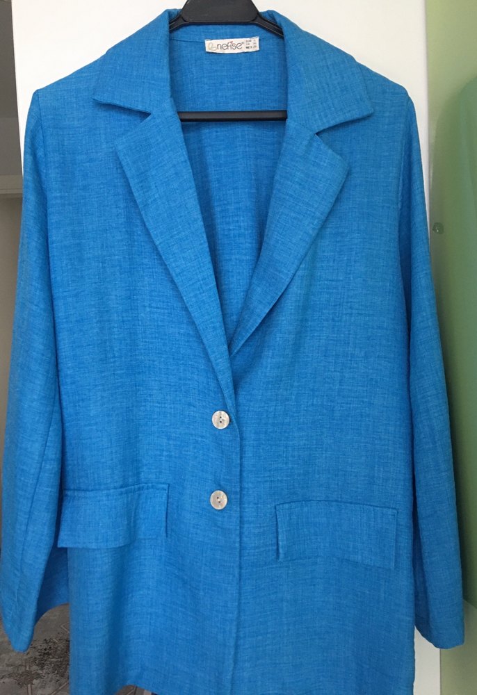 Mavi keten kumaştan, düğmeli, uzun kollu, normal kesim ve midi boy ofis tarzı kadın blazer ceket. ✨ Pantolonuyla birlikte takımdır.