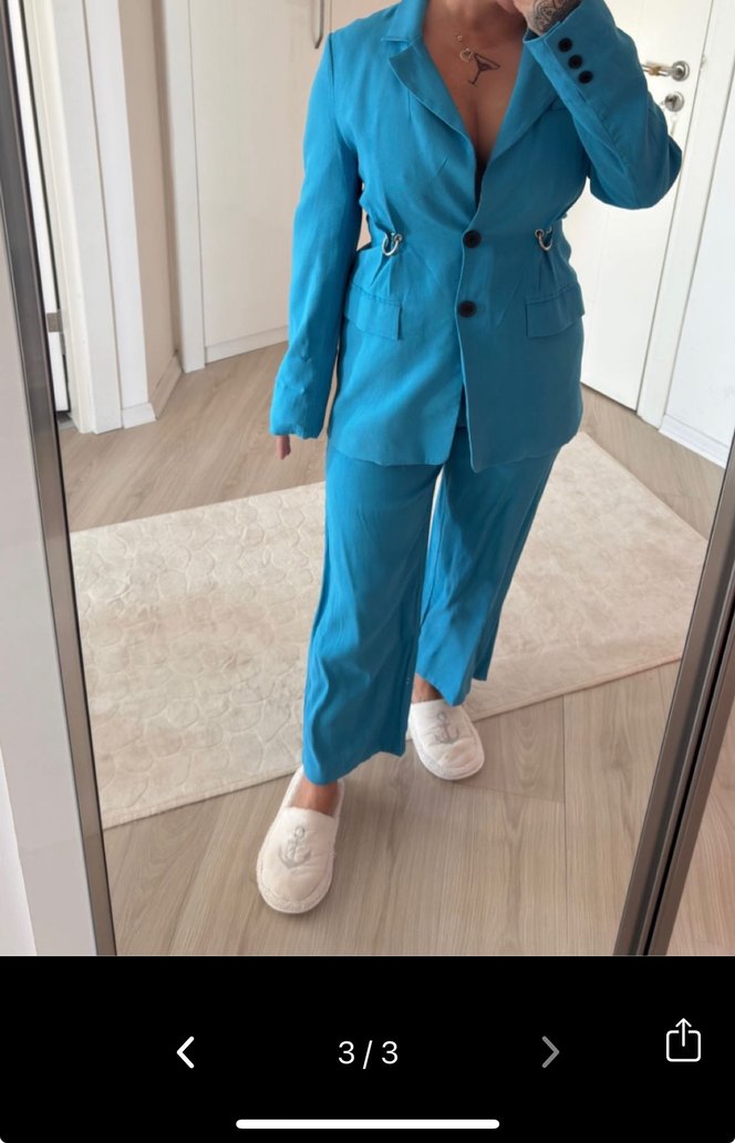 Pastel mavi keten kumaştan, düğmeli, yakalı ve askılı kollu kadın blazer ceket. Ofis ve günlük sokak stiline uygun, normal kesim.
