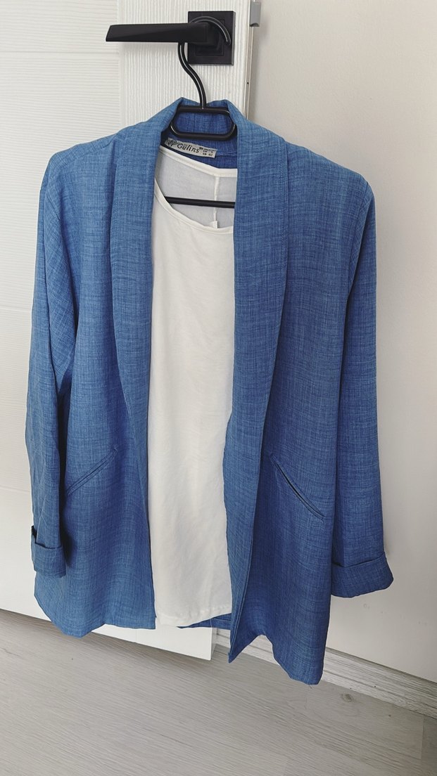 Mavi keten kadın blazer, keskin yaka ve normal kesim ile. Uzun kollu, drapeli tasarımıyla günlük kullanıma uygun