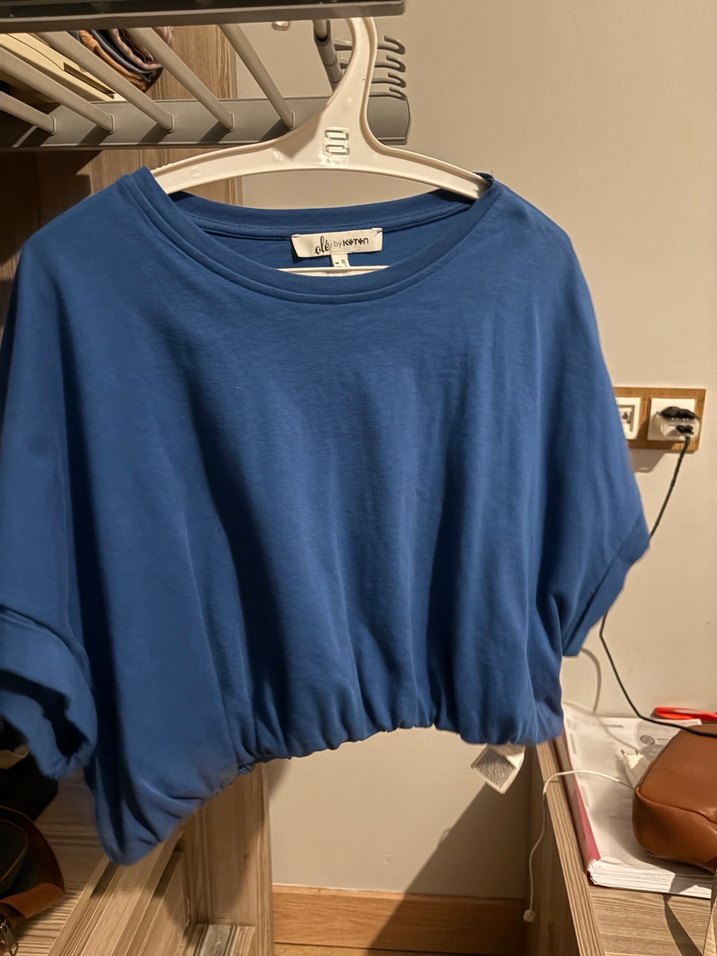 Mavi keten kumaştan, yuvarlak yakalı ve kısa kollu kadın tişörtü. Rahat kesimiyle günlük şıklık sunar, sokak modasına uygundur.