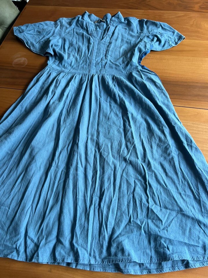 Mavi keten kumaştan, kısa kollu, yakalı, bol kesim, drapeli, desen içermeyen vintage bohem tarzda uzun kadın elbisesi.