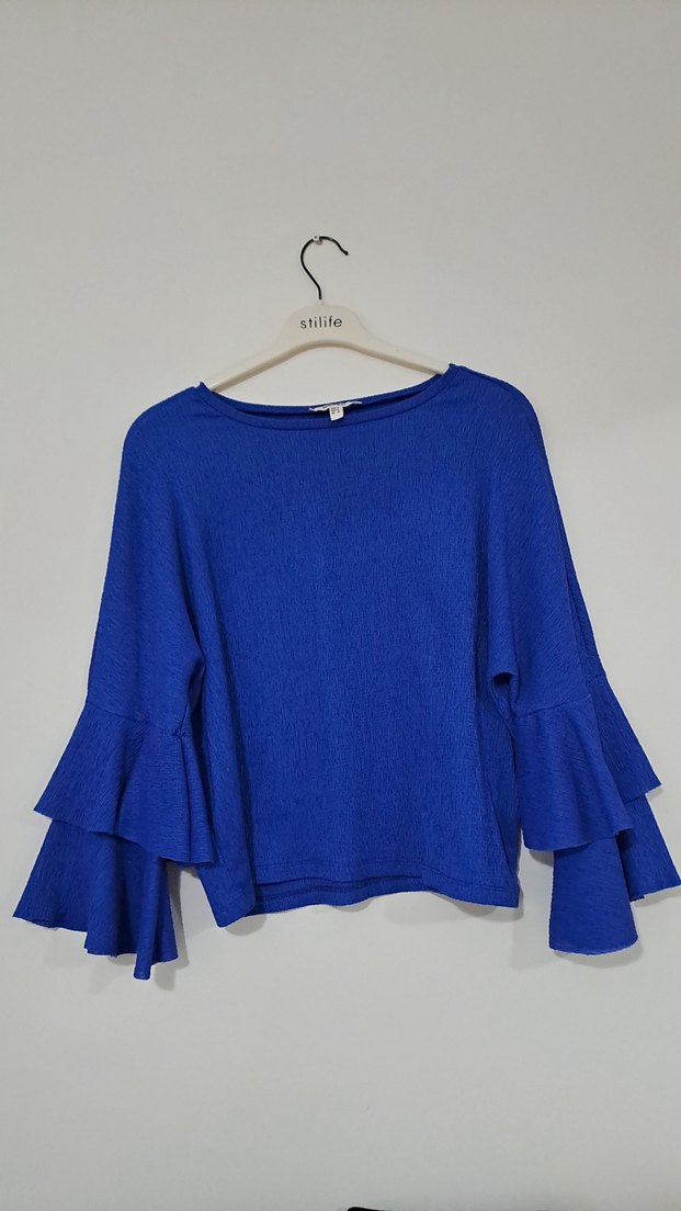 Mavi Keten Kadın Fırfırlı Uzun Kollu Kazak
