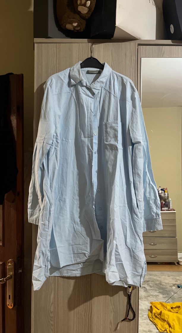 Pastel mavi keten gömlek, yakalı, uzun kollu ve düğmeli, bol kesimdir. Günlük rahat kullanıma uygundur. Mağazin marka keten cep kısmında beyazlık var çok az giyildi İki kol arası 57 cm Tunik boy 83 cm
