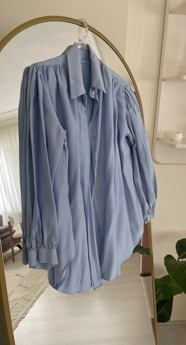 Pastel mavi keten kumaştan, düğmeli ve yakalı, uzun kollu, bol kesim kadın gömleği. Ofis için uygun, normal boyda.