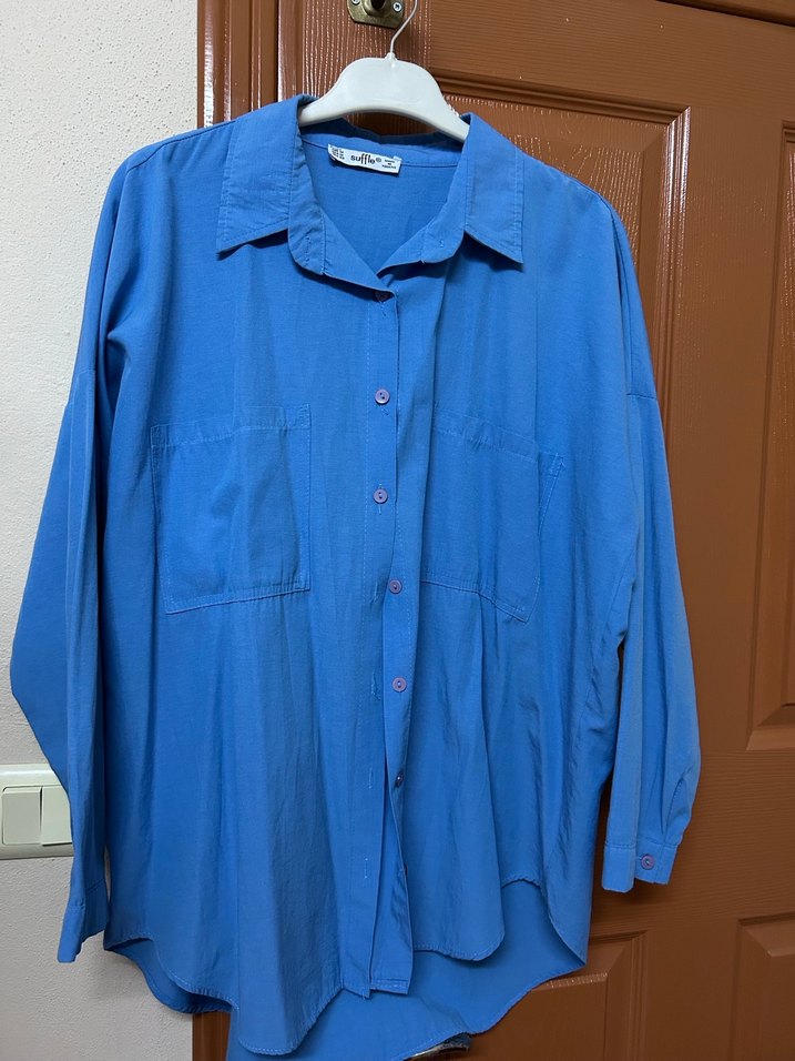 Mavi Keten Kadın Gömlek, Düğmeli, Salaş Kesim