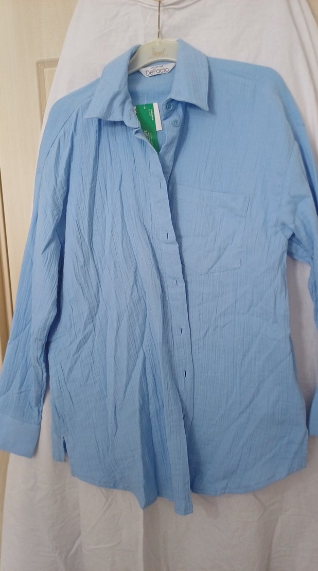 Bu kadın gömleği keten kumaştan, uzun kollu ve düğmeli. Gevşek kesimi ve pastel mavi rengiyle rahat günlük kullanım için uygundur.
