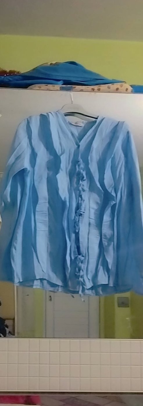 Mavi keten gömlek, uzun kollu, V yaka ve pileli detaylara sahiptir. Bol kesim ve midi boyda, minimal bohem tarzındadır.