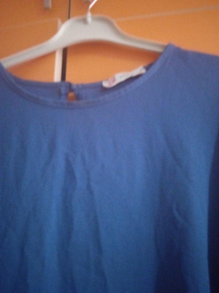 Parlak mavi renkte, yuvarlak yaka ve uzun kollu kadın keten tişört. Bol kesim ve normal midi boyda, düğmeli detaylarla sade ve temel bir stil sunar.