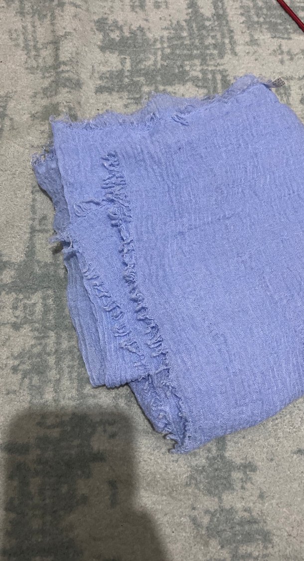Mavi keten kadın şal, fırfırlı kenarlarıyla rahat ve bohem bir tarz sunar. Yumuşak dokusuyla katlama için uygundur.