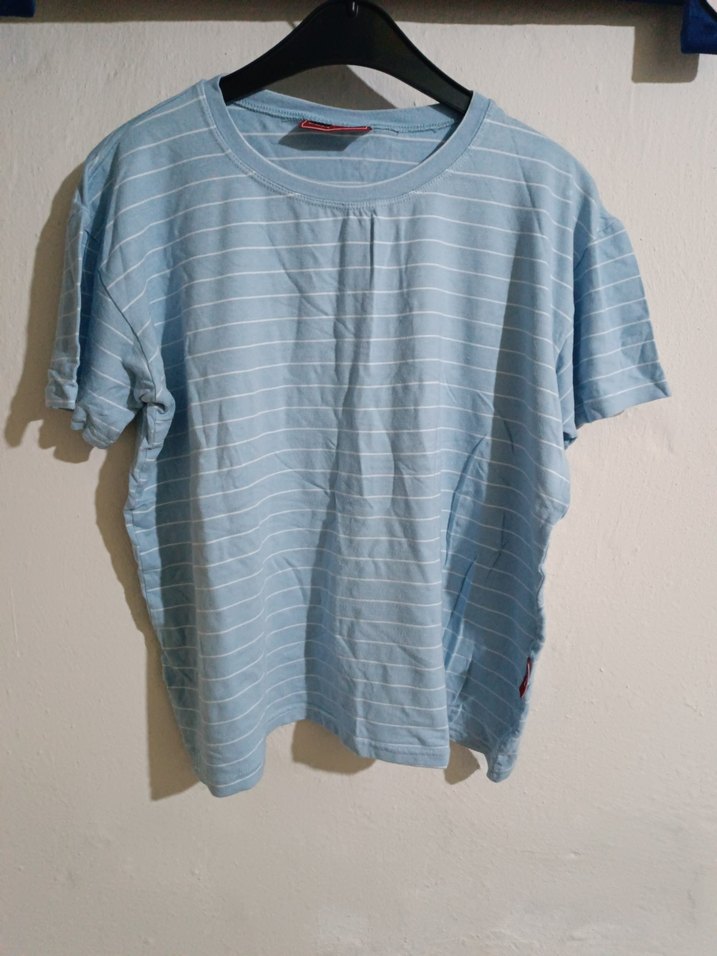 Pastel mavi keten kumaştan, kısa kollu ve yuvarlak yakalı, bol kesim kadın tişörtü. Rahat ve şık günlük sokak tarzı için ideal.