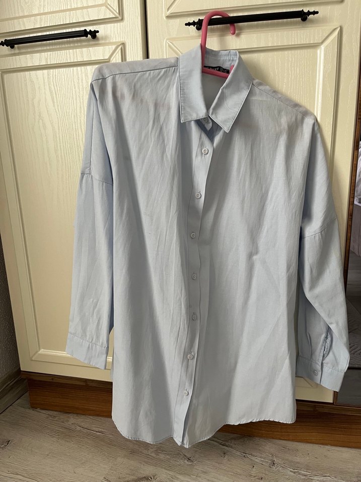 Gri keten kumaştan, yakalı ve düğmeli kadın gömleği. Uzun kollu, normal midi boyda ve rahat kesim. Ofis kullanımı için uygundur.
