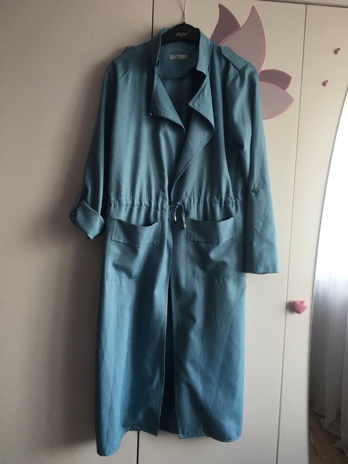Mavi renkte, keten kumaştan üretilmiş uzun kadın trençkotu. Geniş kesim ve kemerli bel kısmı ile minimalist normcore tarz sunar.