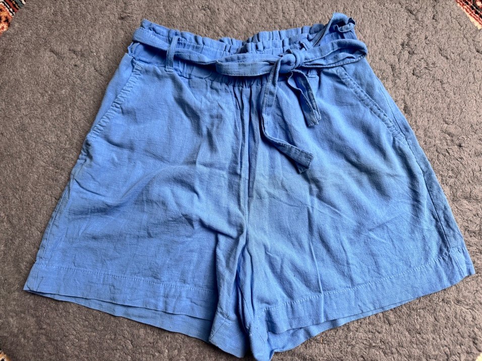 Mavi keten hamile şortu, bol kesim ve kemerli bel detayına sahiptir. Midi boy ve pastel ton, günlük rahat kullanıma uygundur.