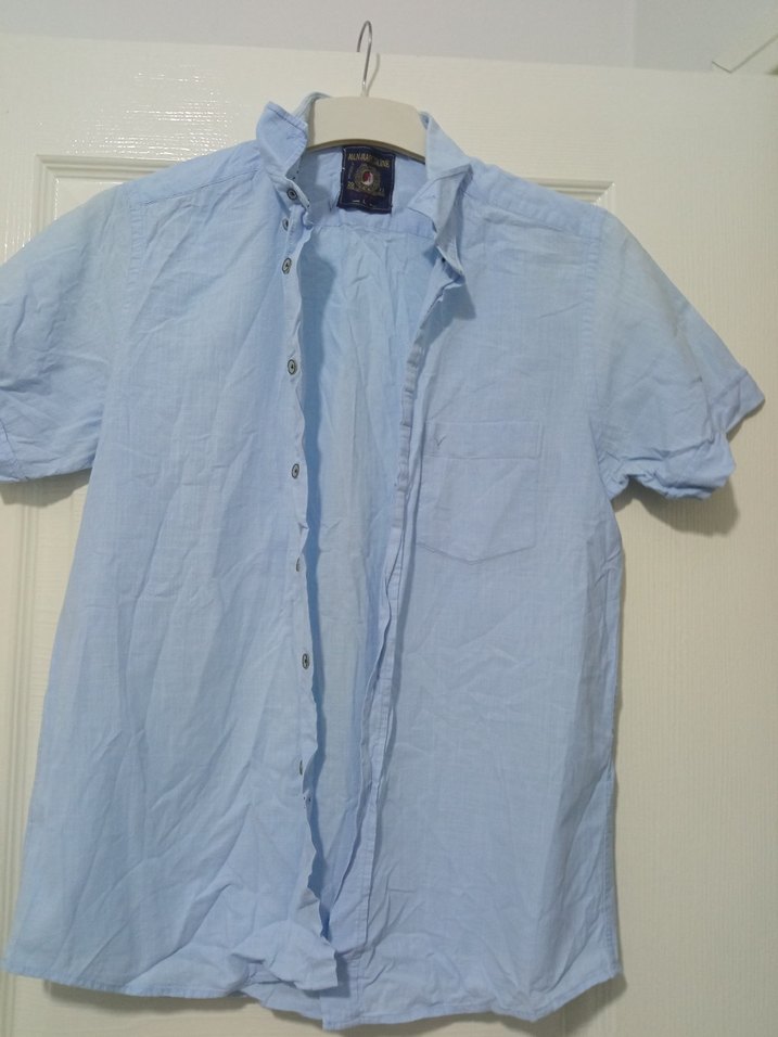 Pastel mavi renkte, keten kumaştan, düğmeli, kısa kollu, yakalı ve cep detaylı bol kesim erkek gömleği. Günlük rahat sokak stili için uygundur.