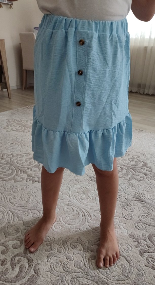 Keten kumaştan, kısa kollu ve fırfırlı detaylı, bohem tarzda, mavi renkli bol kesim kız elbisesi.
