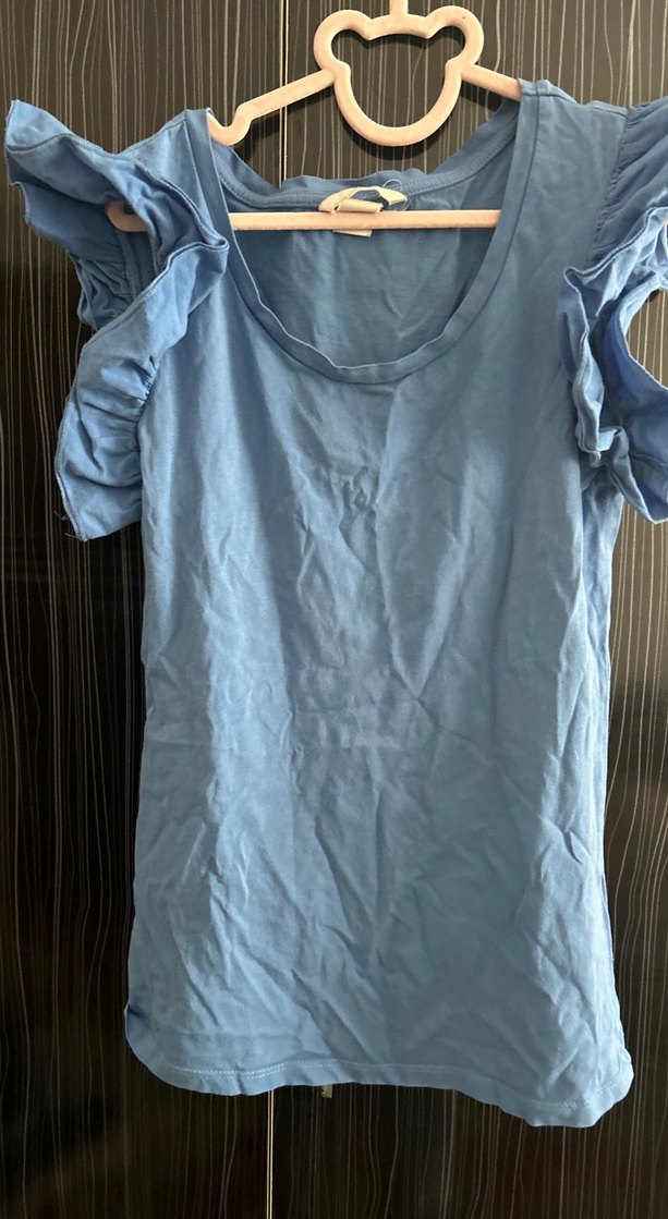 Keten kumaştan, kısa kollu ve bisiklet yaka, mavi tonlarında pastel renkli, drapeli ve vücuda oturan hamile tişörtü. Günlük kullanıma uygun, minimal ve şık.
