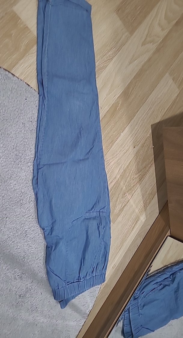 Mavi keten kumaştan, salaş kesim ve drapeli tasarıma sahip kadın pantolonu, günlük kullanım için rahat ve trend bir sokak stili sunar.