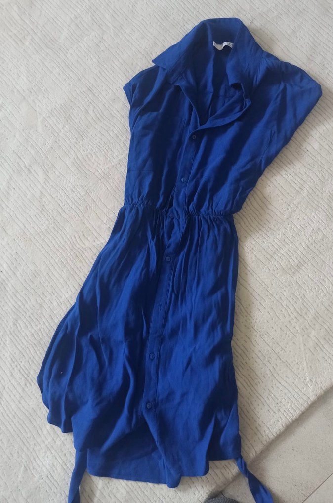 Keten kumaştan, yakalı ve kolsuz, drapeli, vücuda oturan, koyu mavi midi elbise. Minimalist ve bohem tarzda, günlük kullanıma uygun.