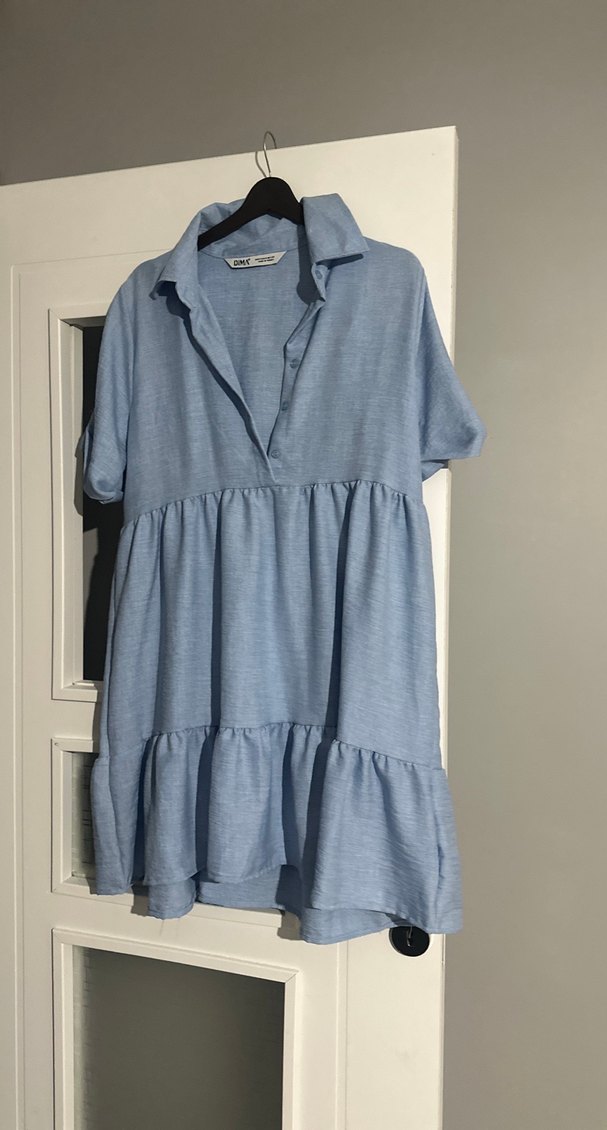 Mavi keten midi elbise, gömlek yaka ve kısa kolludur. Bol kesim ve volan detaylarıyla bohem tarzı yansıtır.