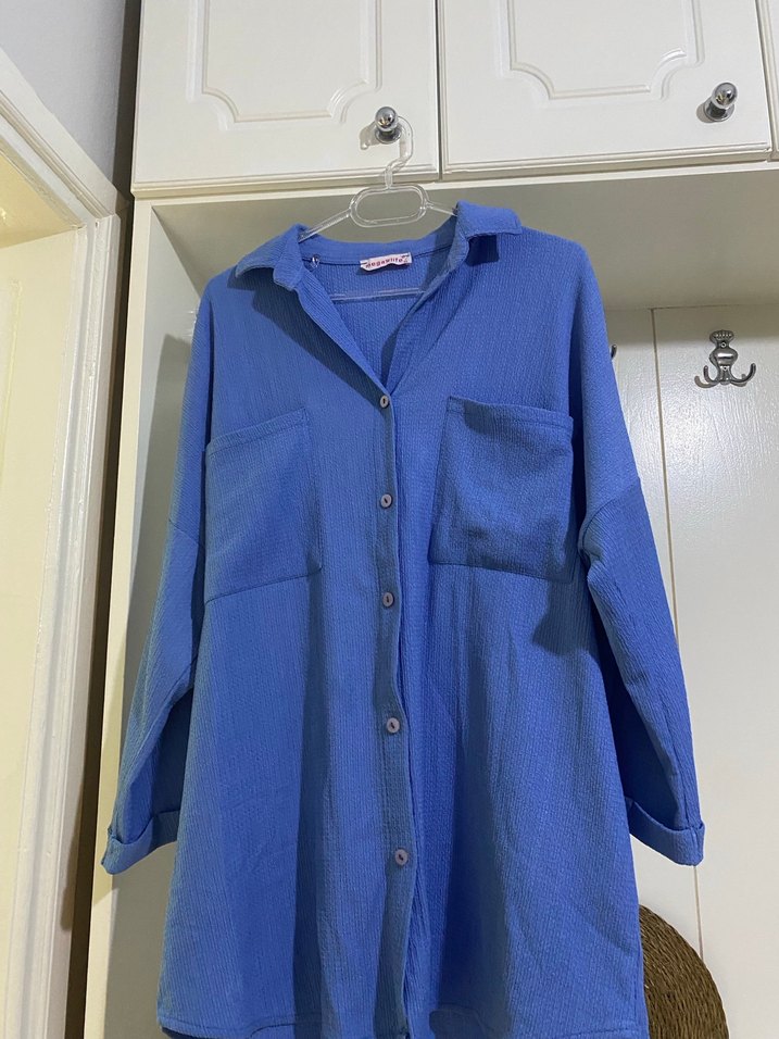 Düğmeli, keten kumaştan, uzun kollu mavi gömlek. Notlu yaka ve midi boyda, rahat kesim, günlük sokak stili için uygun.