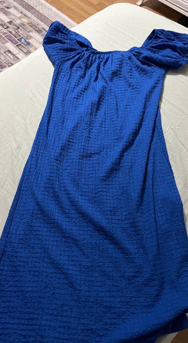 Mavi keten midi elbise, bol kesim ve drapeli tasarıma sahiptir. Straplez ve kolsuzdur, bohem ve minimalist tarzda günlük kullanıma uygundur.