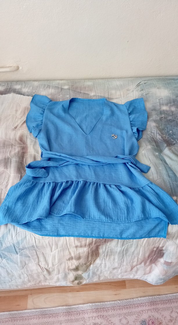 V yaka ve kısa volanlı kollara sahip, bol kesim mavi keten mini hamile bluzu.