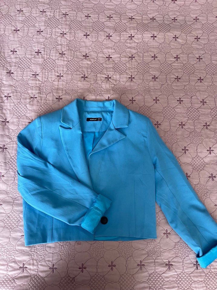 Mavi keten kumaştan, kısa kesim ve düz kesim uzun kollu, yakalı, düğmeli kadın blazer ceket. Ofis kullanımı için uygundur.