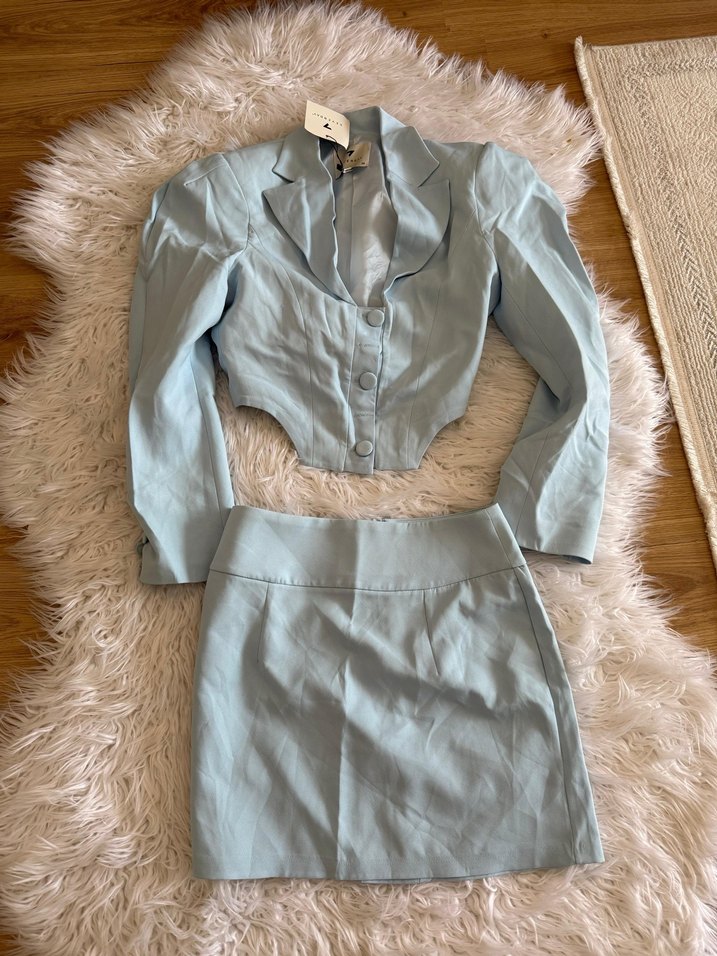 Mavi Keten Mini Kadın Ceket Takım