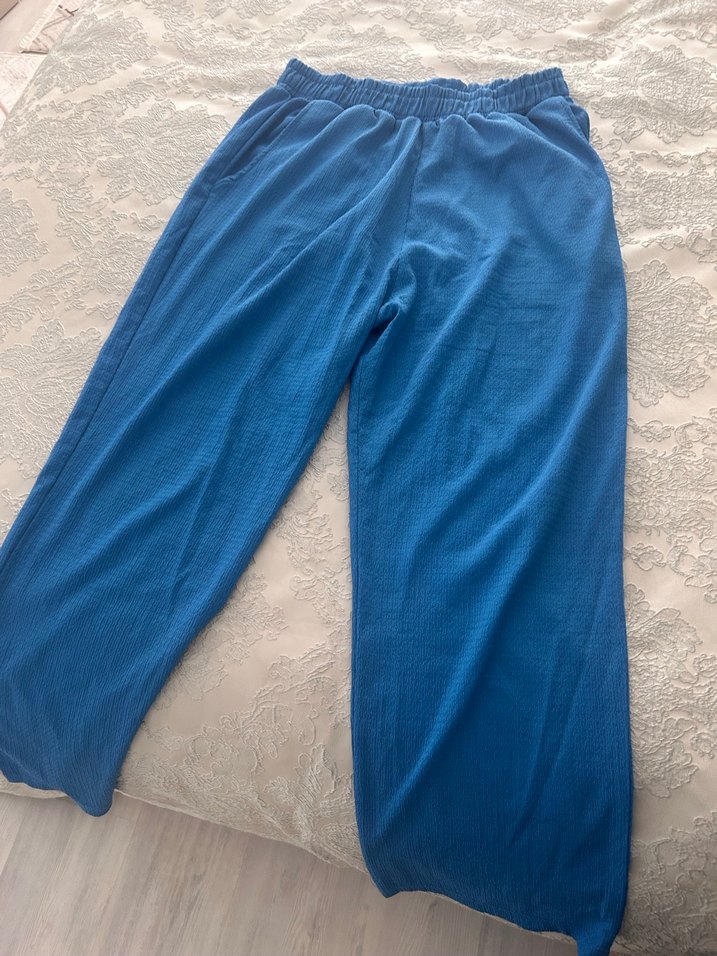 Mavi keten kumaştan, piliseli ve normal boy midi kesim, rahat ve parlak görünümlü kadın pantolonu ve ceket ikili takım yenidir