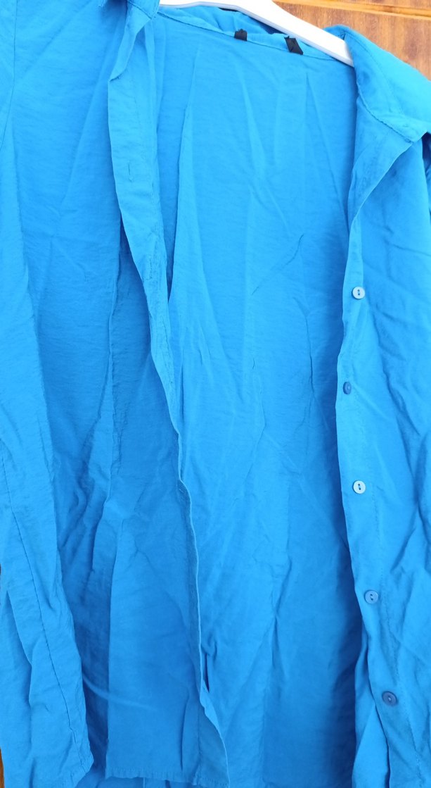 Mavi keten kumaştan, salaş kesim, yakalı ve kısa kollu gömlek. Dökümlü ve batik desenli, minimalist sokak stili için uygun midi uzunlukta gömlek.