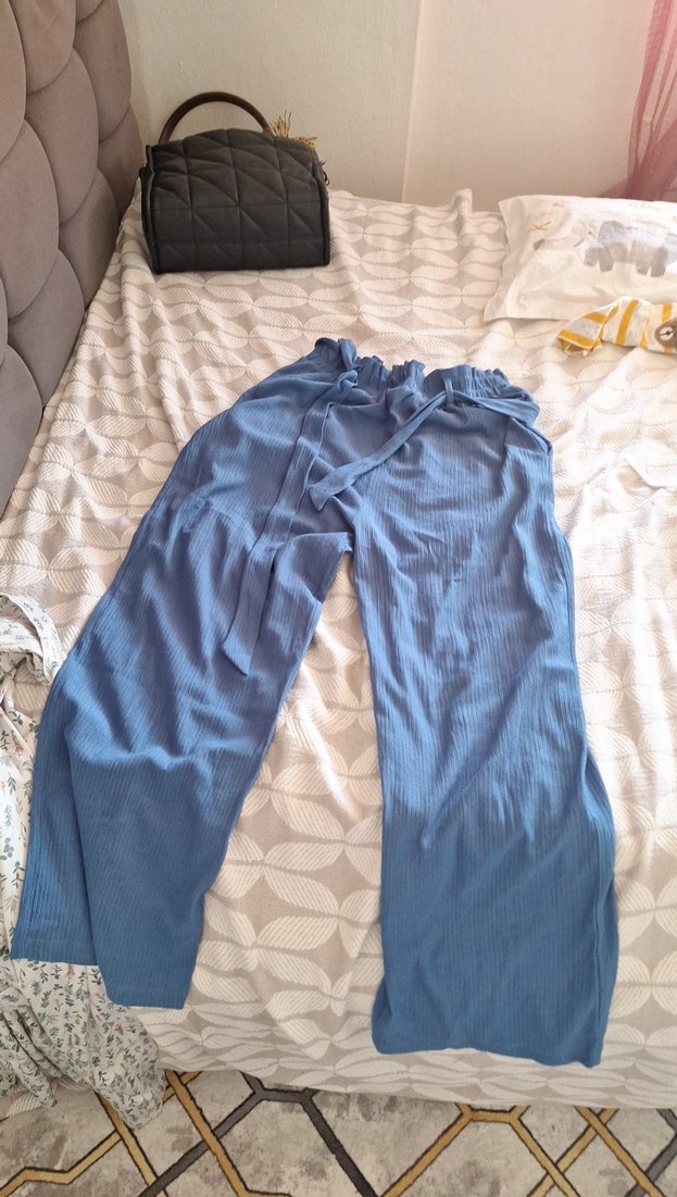 Salaş kesim, keten kumaştan mavi renkte, drapeli ve midi boyda rahat pantolon. Günlük kullanıma uygun.