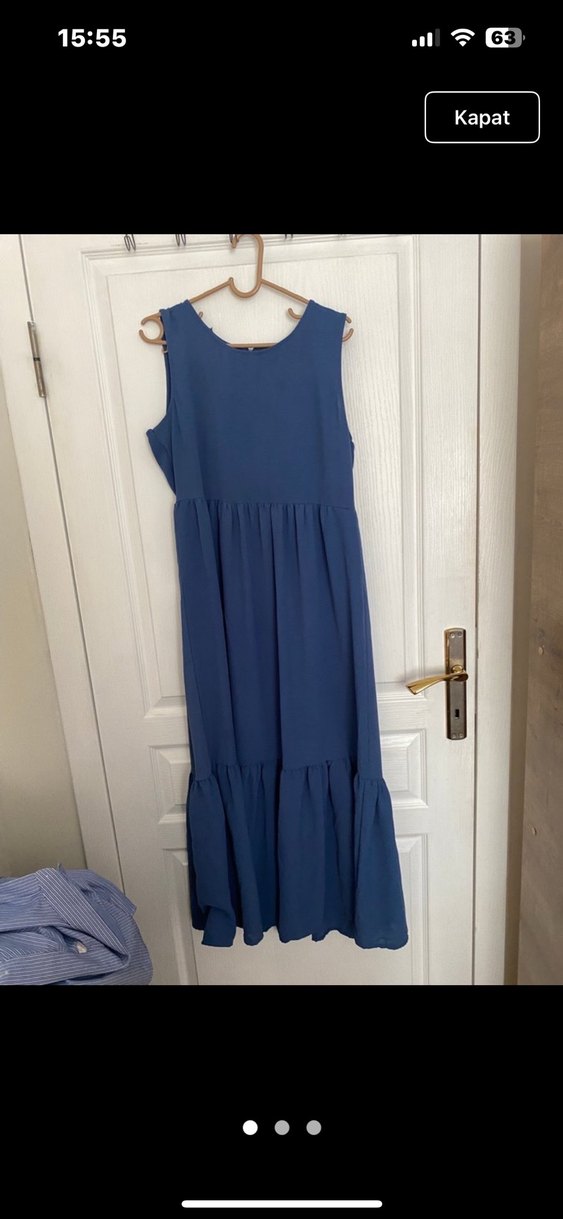 Koyu mavi renkte, keten kumaştan, kolsuz uzun elbise. Salaş kesim, yuvarlak yaka ve fırfır detaylarıyla minimal ve retro tarzda, günlük kullanım için uygun. 40-42 beden uyumlu. Önündeki kusur çok belli olmuyor