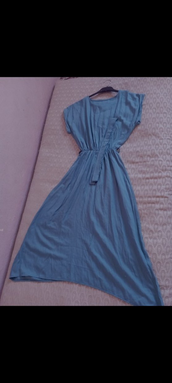Mavi keten uzun elbise, salaş kesim ve drapeli detaylara sahiptir. V yaka ve ince askılıdır, minimalist tarzda günlük kullanıma uygundur.
