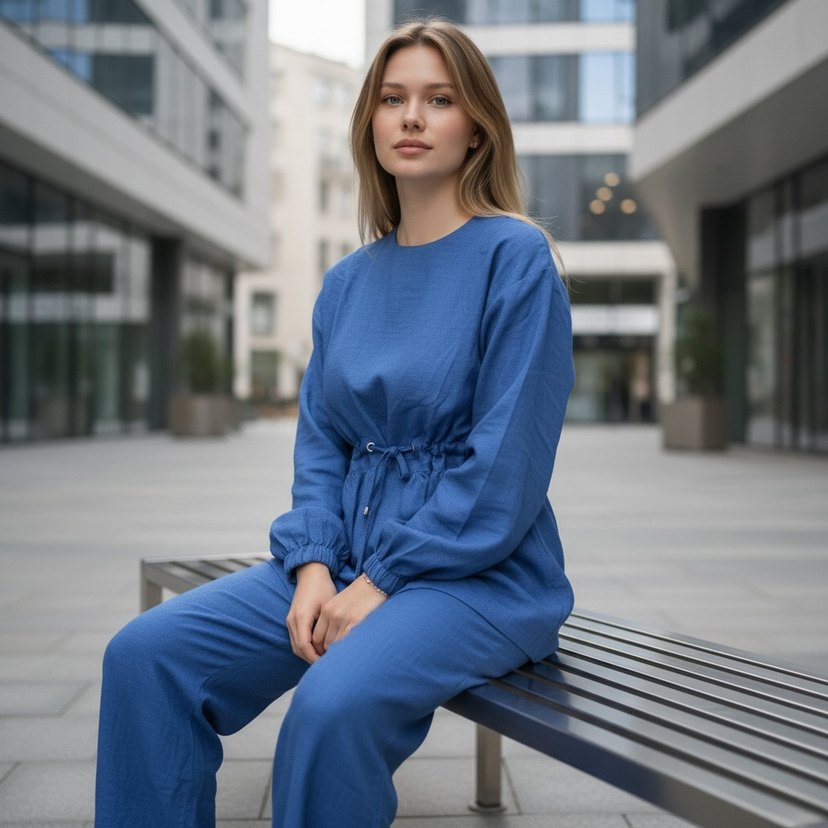Mavi renkte, uzun kollu ve bisiklet yaka olan kadın takım, rahat kesimi ve denim kumaşıyla günlük kullanıma uygun, zahmetsiz şıklık sunar. Bedenli