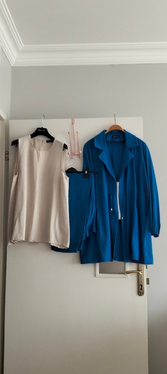 Günlük kullanıma uygun, uzun kollu ve kesik yakalı, mavi keten üçlü takım. Rahat kesimi ve şık görünümüyle öne çıkar.