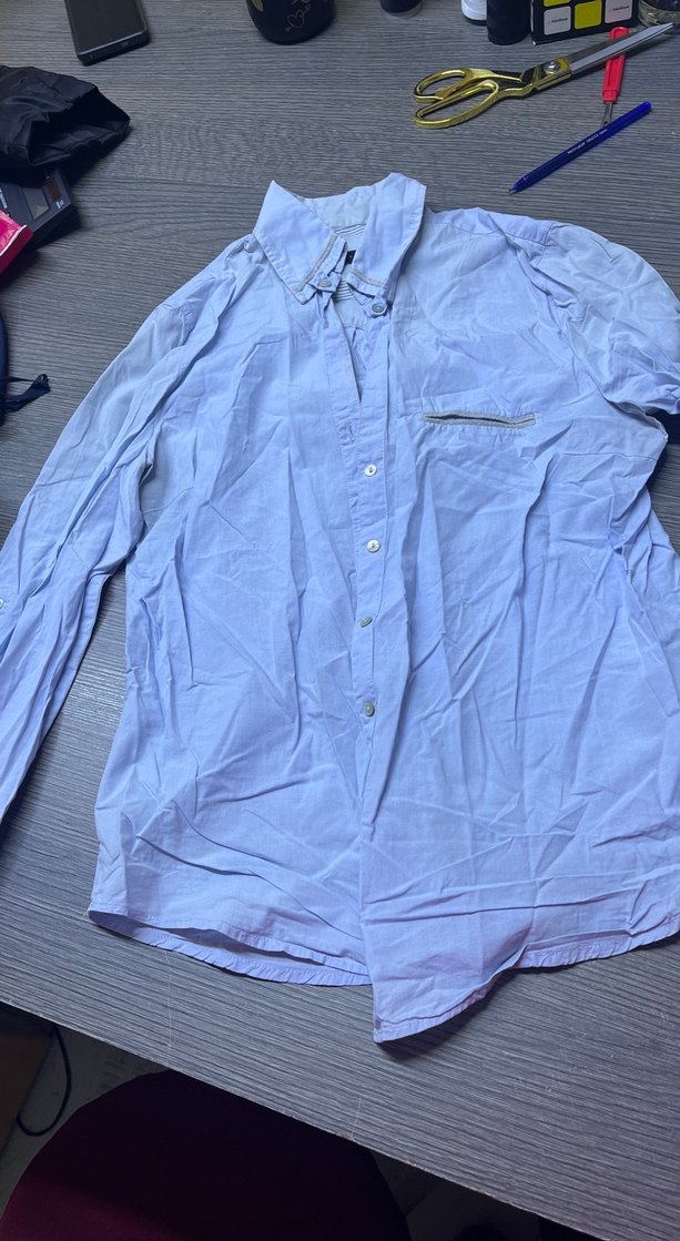 Mavi keten kumaştan, düğmeli, yakalı ve uzun kollu, rahat kesim günlük kullanıma uygun gömlek.