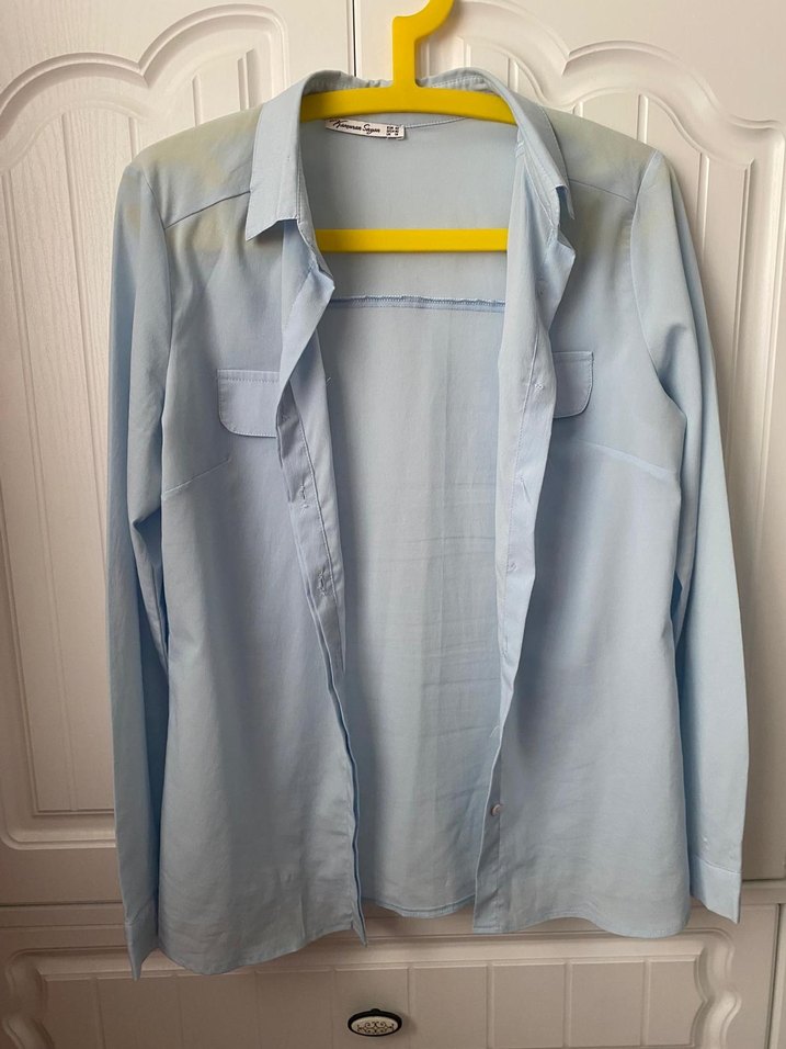 Pastel mavi renkte, keten kumaştan uzun kollu, düğmeli ve yakalı gömlek. Normal kesim, desensiz ve günlük kullanıma uygun sade tasarım.