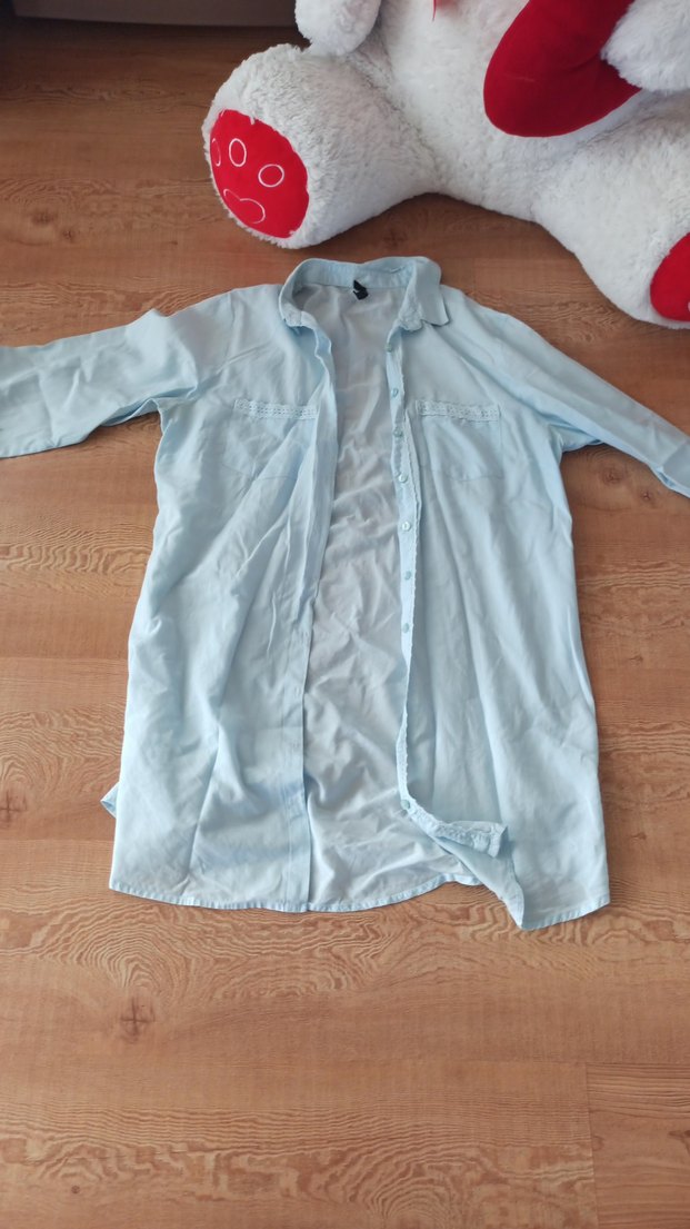 Pastel mavi keten kumaştan, düğmeli ve yakalı uzun kollu, bol kesim gömlek. Rahat ve günlük kullanıma uygun. Ürün kullanılmıştır Resimde Gördüğünüz gibi