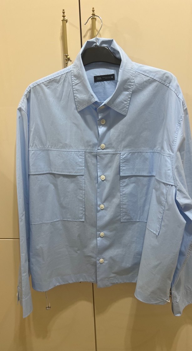 Mavi poplin kumaştan, uzun kollu ve düğmeli, notched lapel yaka detaylı, günlük kullanıma uygun rahat kesim ince ceket