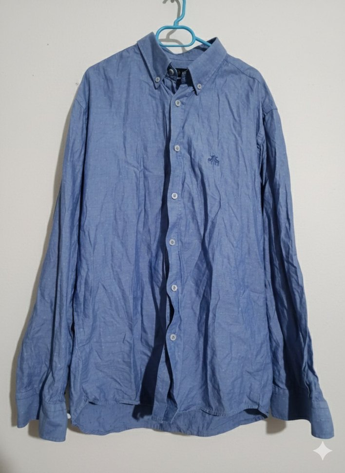 Mavi keten kumaştan, düğmeli ve uzun kollu erkek gömlek. Salaş kesimi ve yakalı tasarımıyla günlük rahat sokak stili için uygundur.