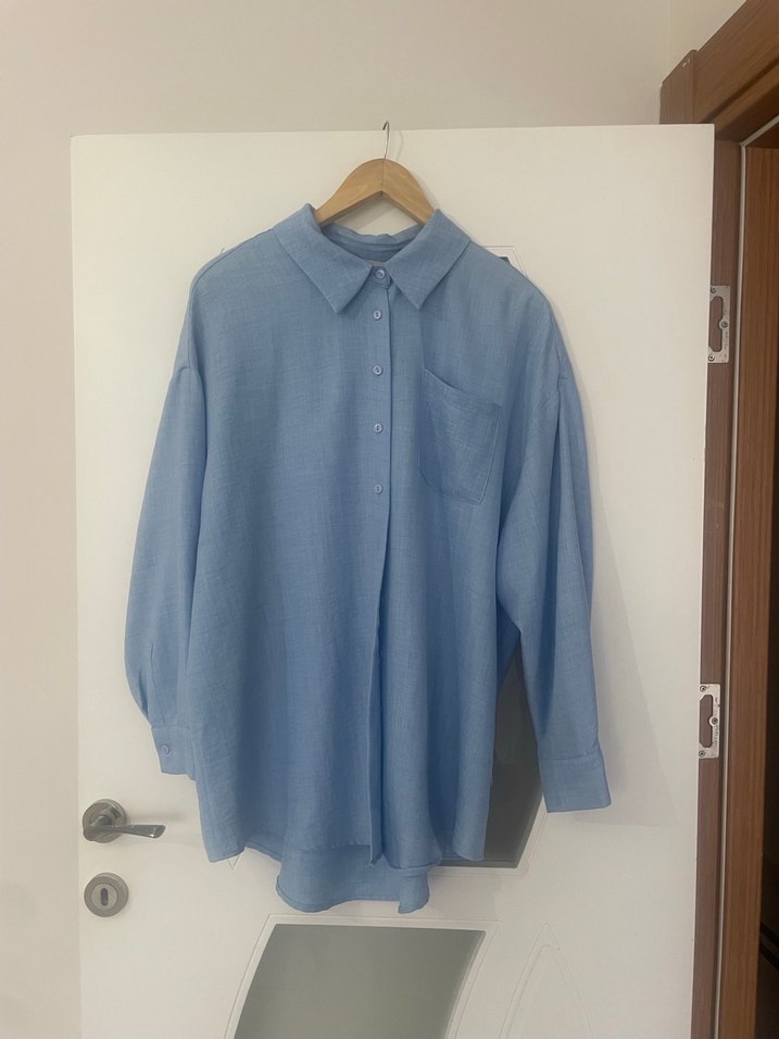 Mavi keten kumaştan, uzun kollu, düğmeli, yakalı ve bol kesim gömlek. Minimalist ve sade tarzda, günlük kullanım için uygundur. Kevsersarığlu trenyolmilla markasından aldım sıfır gibidir